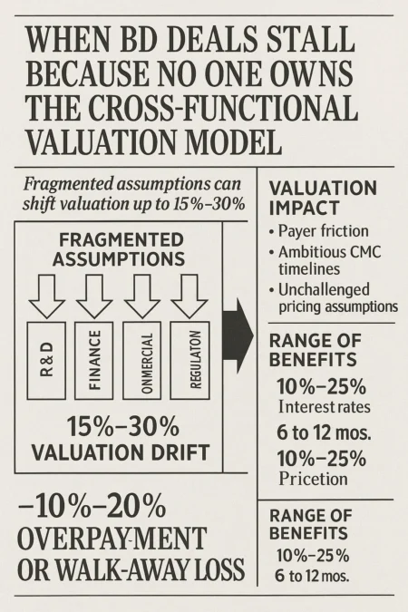 In most licensing auctions, the cross-functional valuation model becomes the silent failure point that no one admits to, driving a predictable 15–30% valuation drift and forcing BD leads into late-stage renegotiations that damage board credibility. When assumptions fragment across Functions, your risk isn’t theoretical — it’s a direct 10–20% overpayment or a blown walk-away moment that follows you for years. Join the Weekly Pharma BD Signals newsletter for execution checklists and deal-room breakdowns.